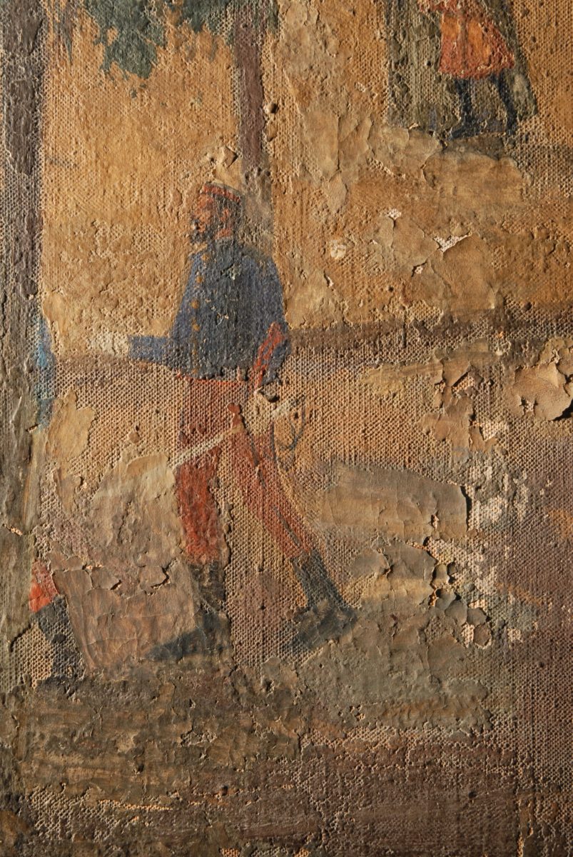 Al llarg del procés de restauració es van trobar alguns estrips petits i zones on faltaven fragments de tela, però a la part central, sota gruixos de pintura, guix i cola, hi havia un estrip de 18 x 21 cm. Es van poder retirar aquests materials i tancar l’estrip mitjançant tècniques de microsutura i afegint-hi empelts.