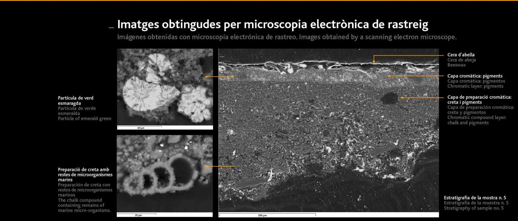 Les anàlisis fisicoquímiques de vuit mostres de pintura de punts significatius de l’obra, a càrrec del Grup d’Anàlisi de Materials de Patrimoni Cultural del Departament d’Enginyeria Química, de l’Escola Politècnica Superior d’Enginyeria de Vilanova i la Geltrú, de la Universitat Politècnica de Catalunya, van confirmar l’existència d’una capa de preparació molt absorbent de carbonat de calci que presentava diferents tonalitats cromàtiques segons la localització de les mostres (partícules de quars, partícules vermelles de cinabri i de verd d’arcetoarsenit de coure). A la pintura original es van identificar pigments habituals al segle XIX (verd maragda, blanc de plom, negre carbó, groc de plom, blau de Prússia, vermell cinabri, silicats i òxids de ferro) i l’aglutinant original de cola animal. A les pintures sobreposades es van identificar pigments que s’havien descobert i utilitzat al voltant del 1920 (blanc de titani i blau de cobalt), i com a aglutinant resines alquídiques i acríliques que corresponien a capes de pintura afegides. Totes les mostres van confirmar la presència de cera d’abelles, que en molts casos havia penetrat fins a les capes més profundes.